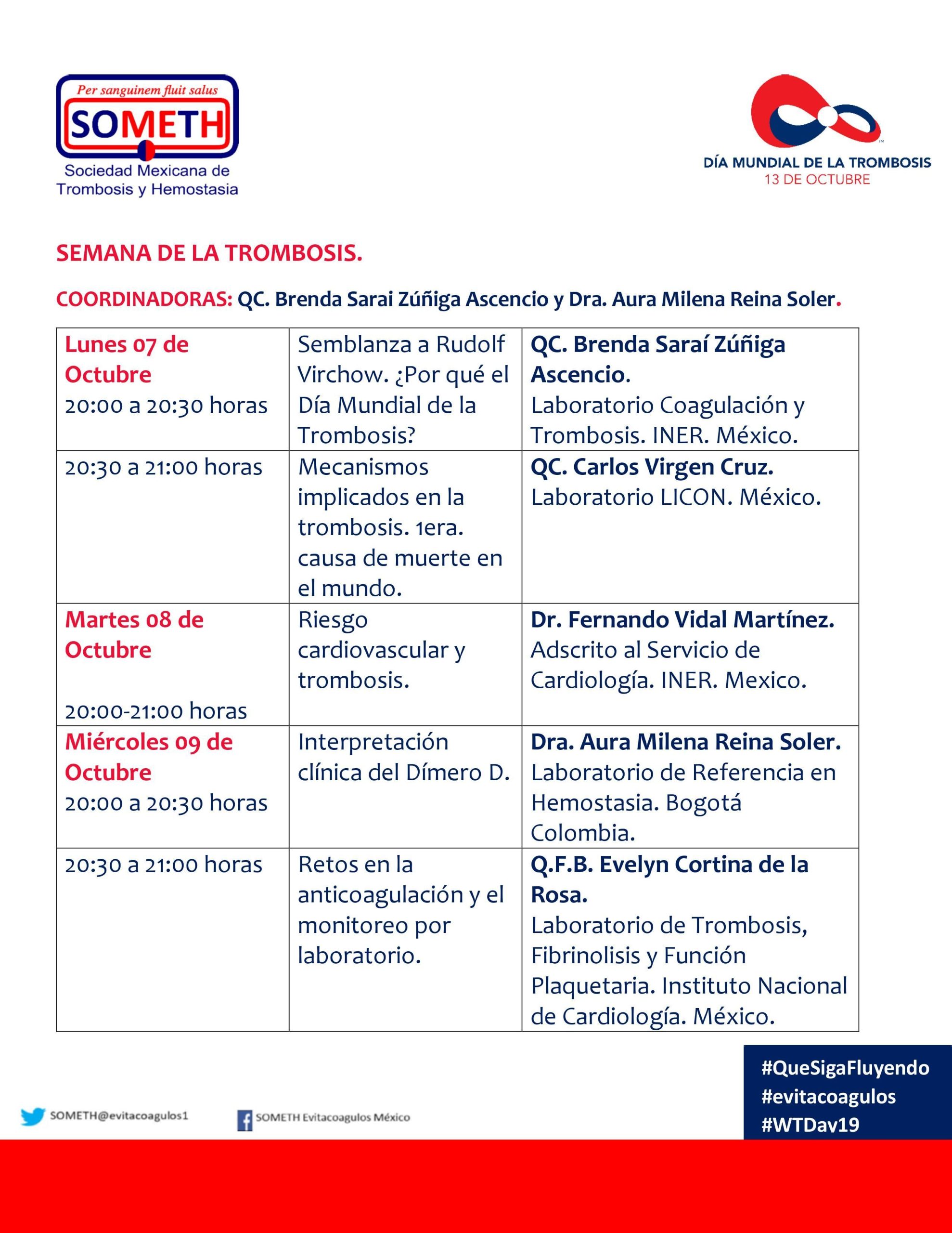 COMUNICADO DE PRENSA DÍA MUNDIAL DE LA TROMBOSIS 13 DE OCTUBRE 2019 Movimiento global de concientización ante desconocimiento y subestimación existente de la enfermedad Ciudad de México, 3 de octubre de 2019. Conmemorado anualmente cada 13 de octubre desde el 2014, la Sociedad Internacional de Trombosis y Hemostasia (ISTH por sus siglas en inglés) pone…
