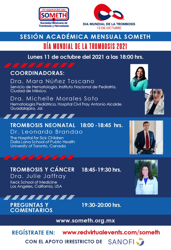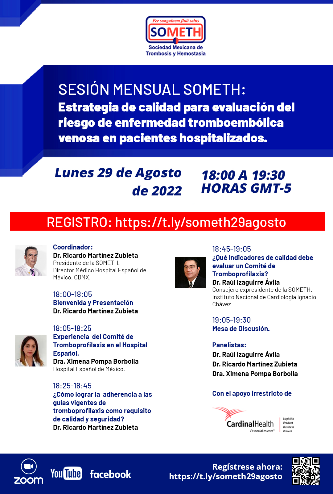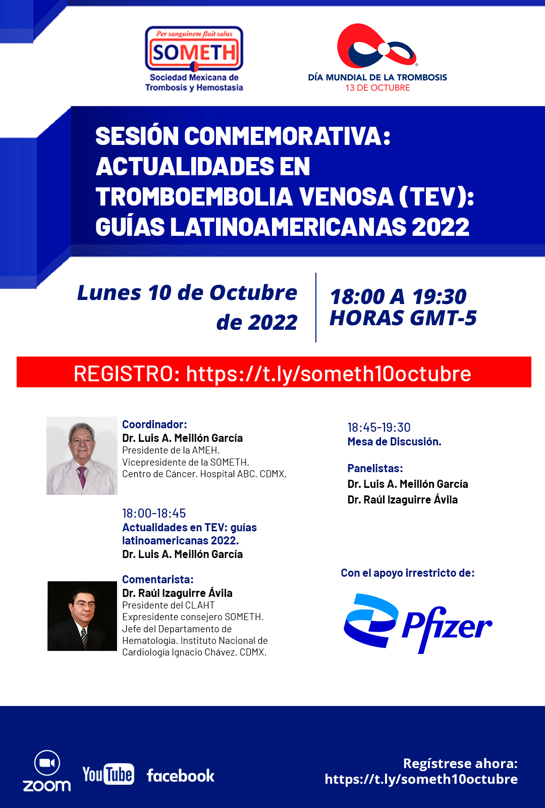 Click aquí para registrarse https://t.ly/someth10octubre  Coordinadora:Dra. Xochitl Cota RangelSan Telmo Medical Center. Hematología. Unidad de Medicina en la Universidad Cuauhtémoc. Aguascalientes, Ags. 18:00-18:05Bienvenida y presentaciónDra. Xochitl Cota Rangel 18:05-18:35Actualidades en cáncer y trombosis en la era de los anticoagulantes orales directos (ACODs).Dr. Luis J. Marfil RiveraHematología. Hospital Universitario Dr. J. Eleuterio González.Monterrey, N.L. 18:35-19:30Mesa de Discusión….