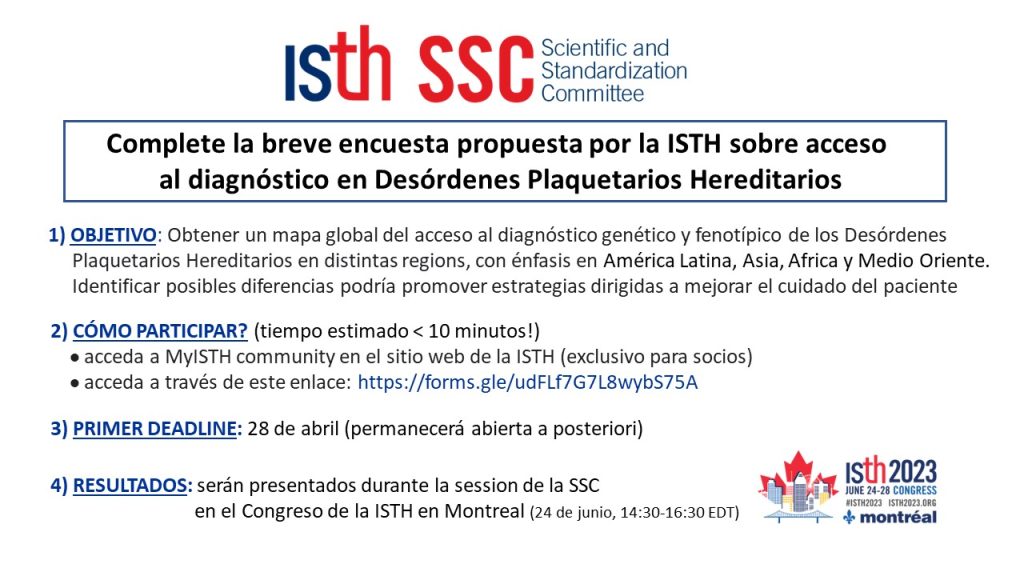 El Subcomité de Estandarización (SSC) en Genómica en Hemostasia y Trombosis de la Sociedad Internacional de Hemostasia y Trombosis (ISTH) ha diseñado una breve encuesta